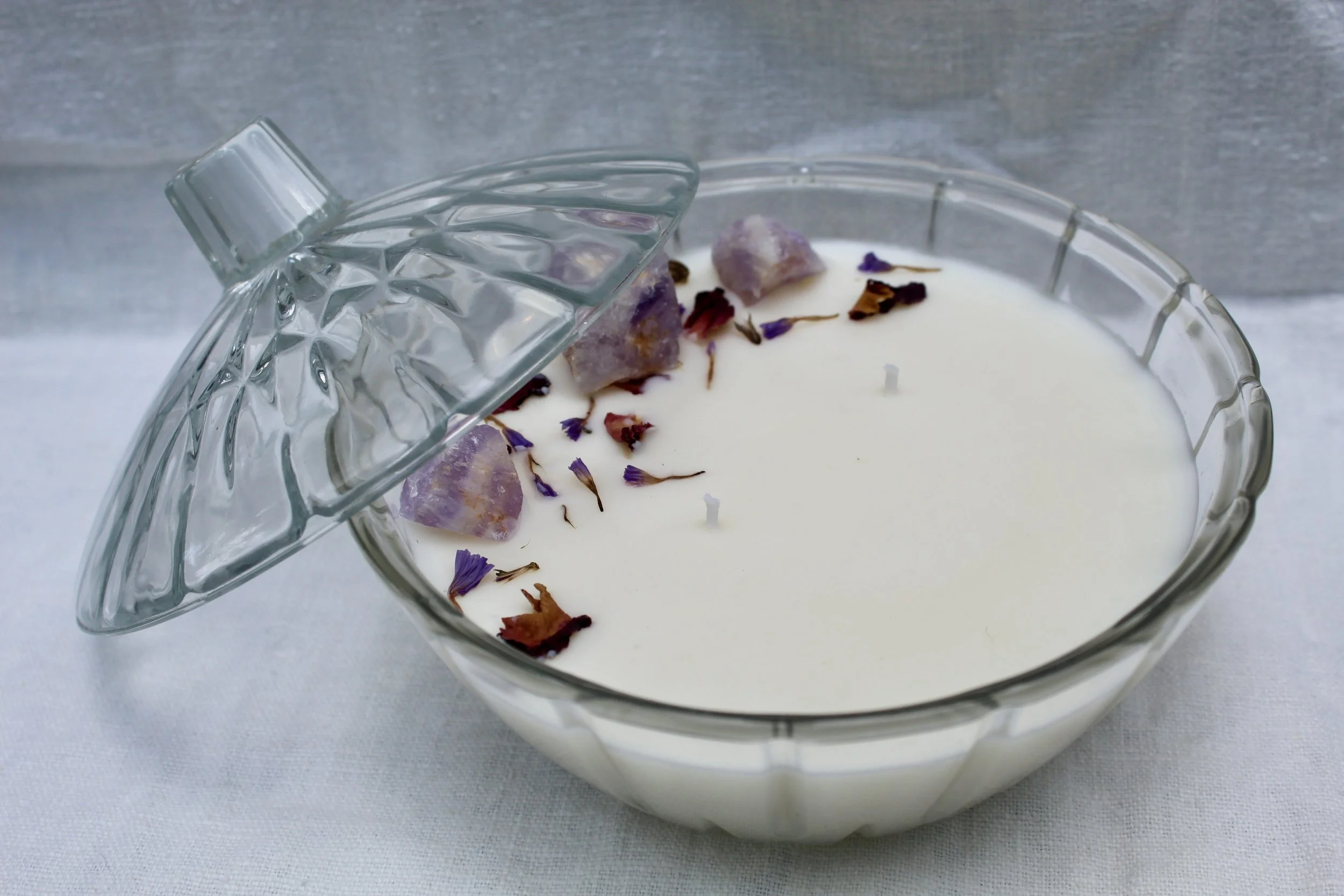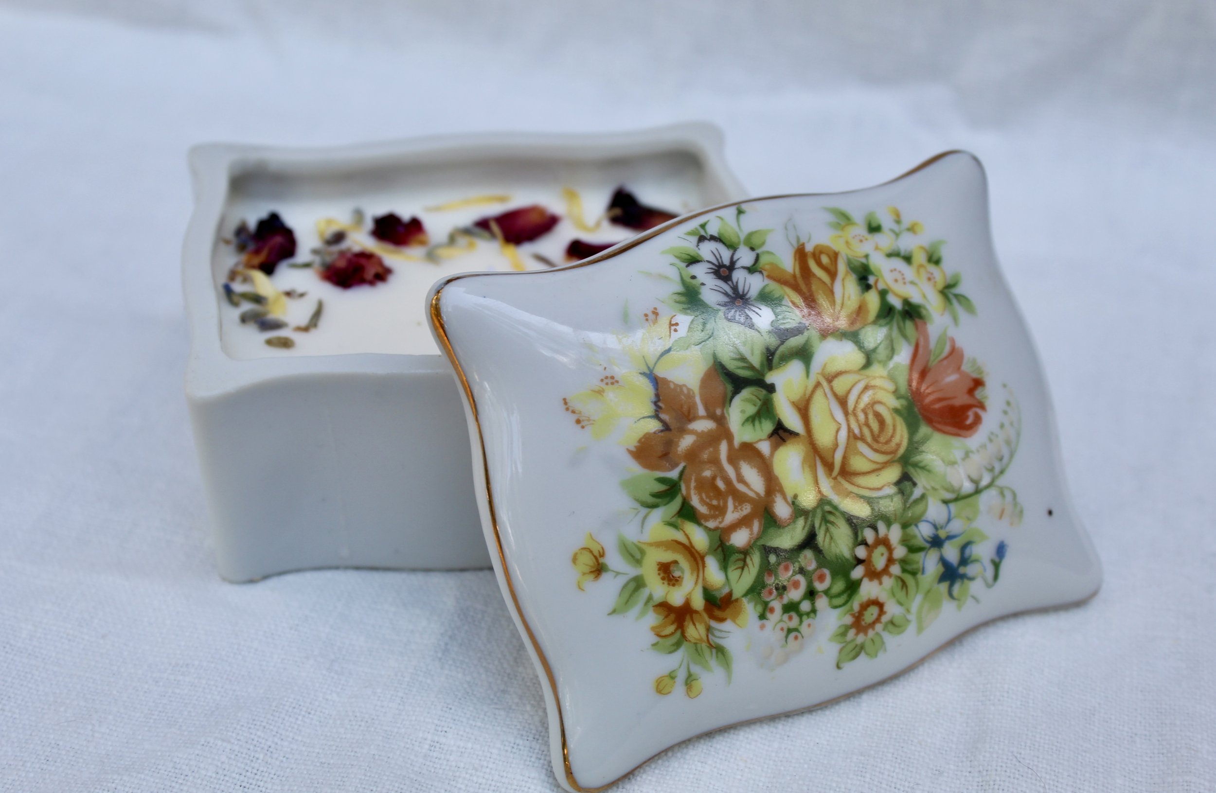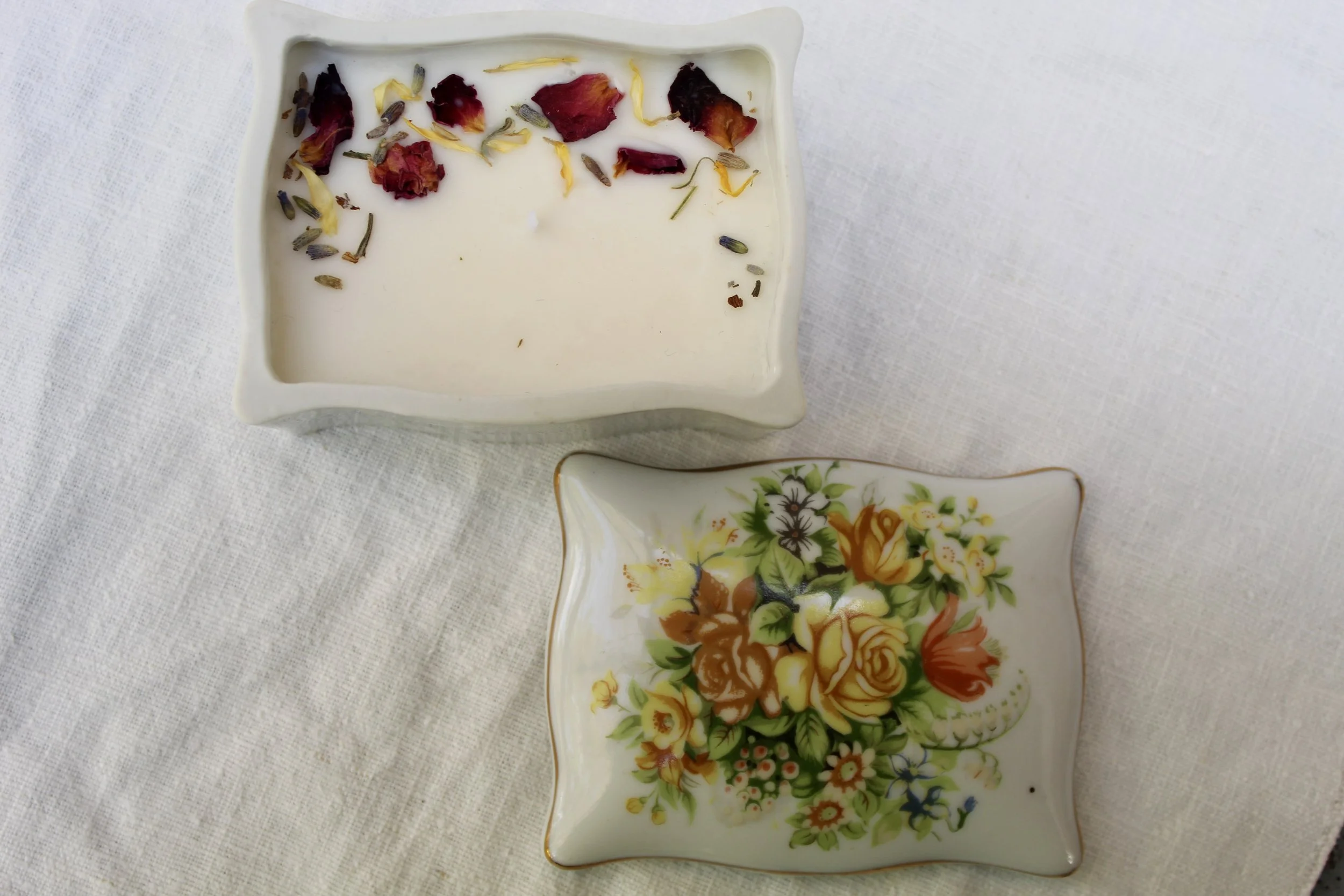 Each Blooming Wicks candle is hand-poured using a creamy soy-coconut wax blend and infused with premium, phthalate-free fragrance oils. We pour them into carefully curated vintage glassware — from delicate teacups to timeless crystal — giving each candle a unique story. Every piece is finished with a touch of dried florals to complement its scent and style, creating a one-of-a-kind experience that’s as beautiful as it is aromatic.